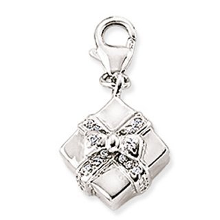A sterling silver parcel shaped charm.Bow design set with cubic zirconia stones.Material - Sterling Silver.Brilliant cut - round shape stones.Dimensions - Charm size10mm diameter.(catch 8mm long).This silver charm comes complete in a presentation box.