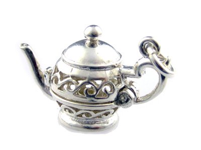 Fine craftsman made Sterling Silver charm made in the UK. Filigree design Tea Pot with hinged opening lid. Inside is a Cup and Saucer. Marked Silver. Free extra silver split ring with every charm for easy home fitting. These are the same type and size as supplied with Links of London charms and bracelets. Supplied in vinyl pouch. This item can be supplied with a lobster trigger catch as an alternative fitting to the rings. If you would like this please let us know immediately on purchase.
