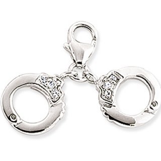 A sterling silver hancuff shaped charm. A pair of handcuffs set with cubic zirconia stones. Material - Sterling Silver. Brilliant cut - round shape stones. Dimensions - Charm size10mm x 10mm each cuff.(catch 8mm long). This silver charm comes complete in a presentation box.